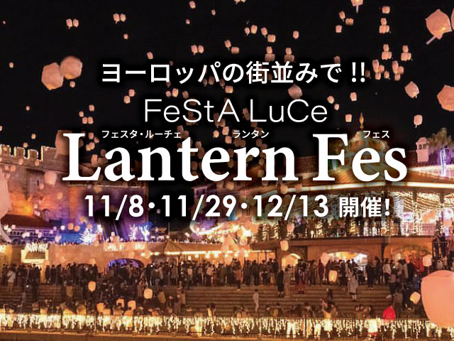 ランタンフェス今年は3回開催毎年大好評の「フェスタ・ルーチェ ランタンフェス」が今年は3回開催します。 さらに11月29日はドローンショーも同時開催で、ランタンとドローンが冬の夜空を彩るWOW!! な日になります。 ヨーロッパの街並みやお城を背景に、冬の夜空に無数のランタンが浮かぶ、まるで夢の世界。 前回はイベント前にチケットが完売しておりますので、気になる方はお早めにチェックしてください。ランタンフェスのチケット販売は10月中旬を予定しています。