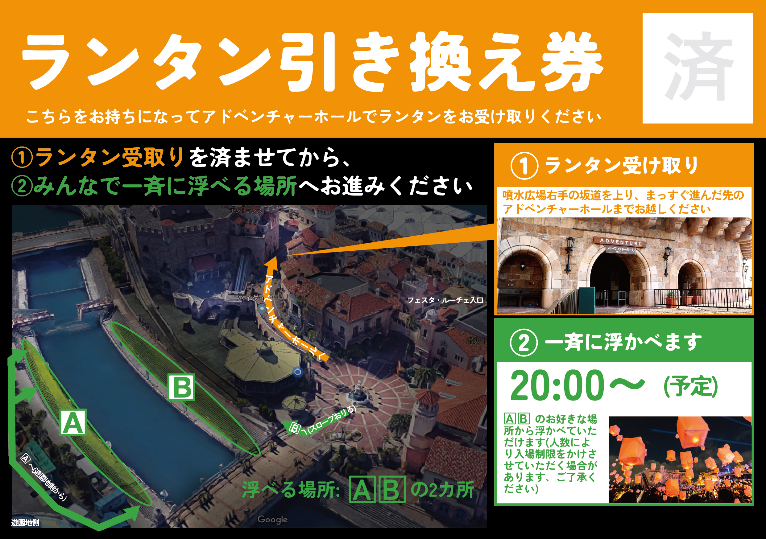 チケット窓口前にランタン専用受付がございますので、そちらで入場券とランタン受取券をお受け取りください。